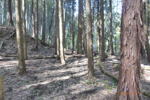 今回の城探訪日記は 滋賀県甲賀市 『隠岐支城群Ⅰ』 この隠岐支城群は一番東側に位置してます 民家脇の細い道を進むと小屋(倉庫)があります この小屋の右手がⅣ郭で左手はⅤ・Ⅵ郭となってます Ⅳ郭北側にある土塁状の高まり Ⅴ・Ⅵ郭へは小屋手前のピンクリボン…
